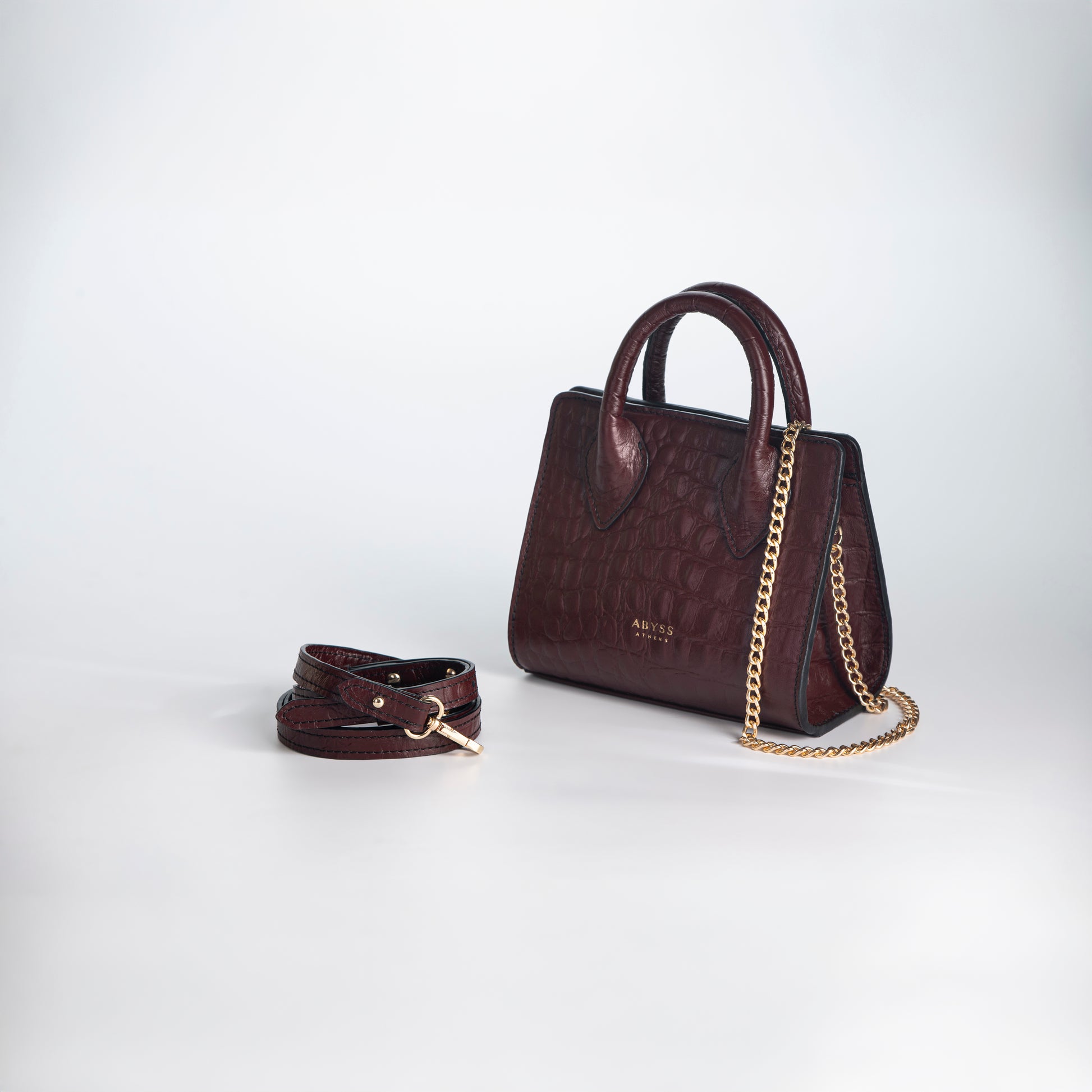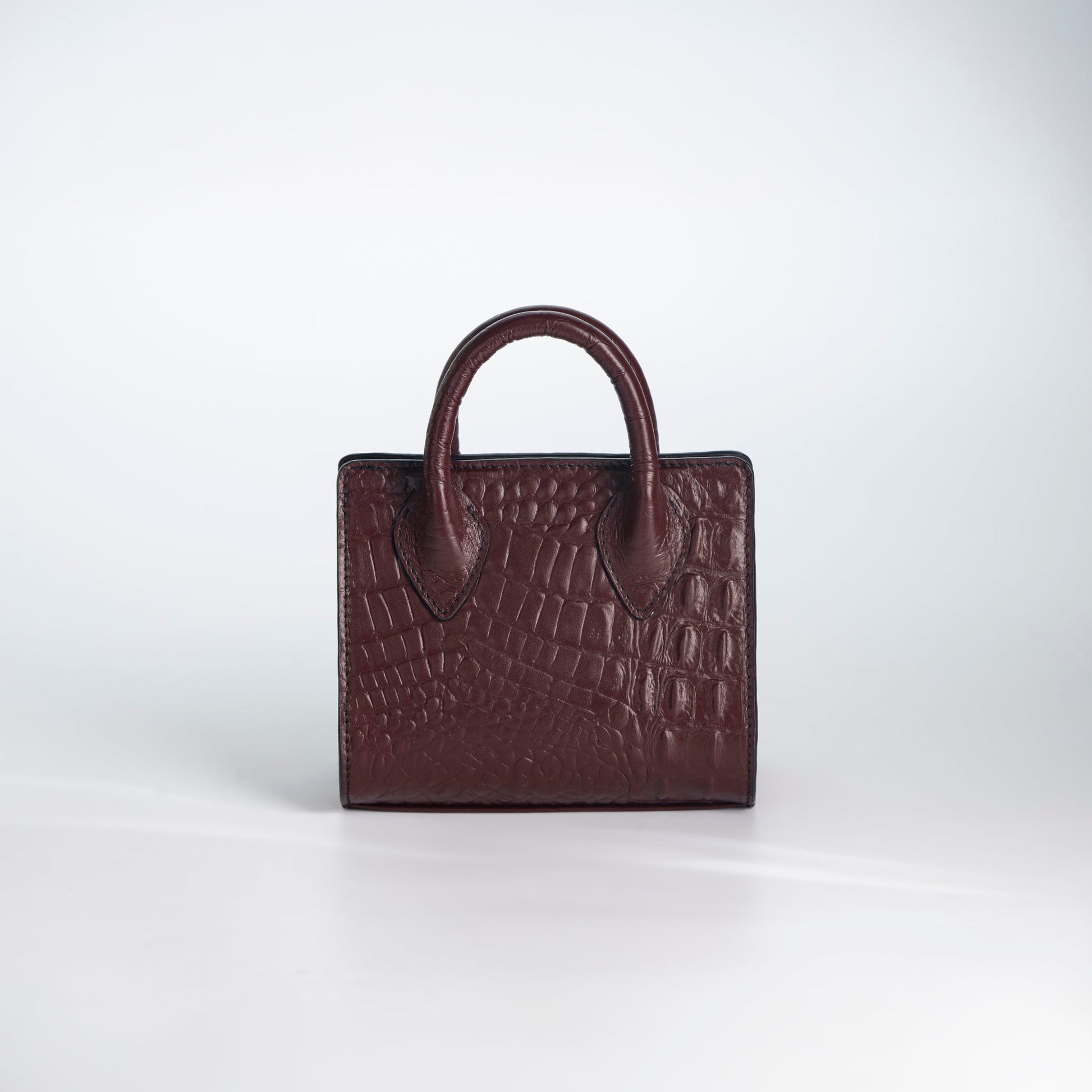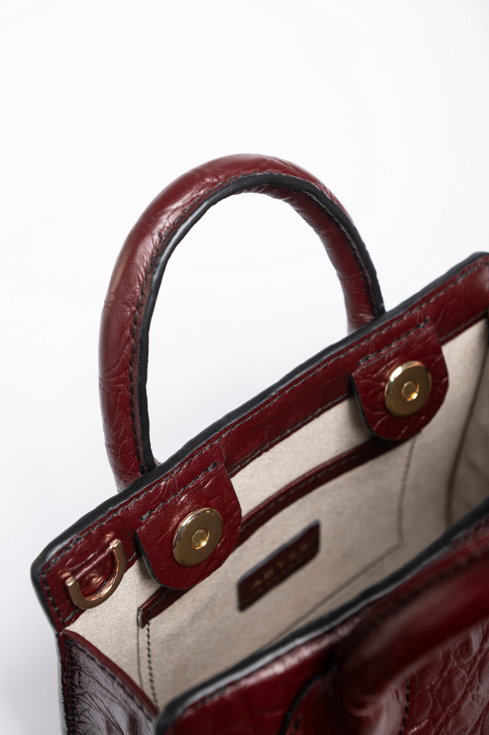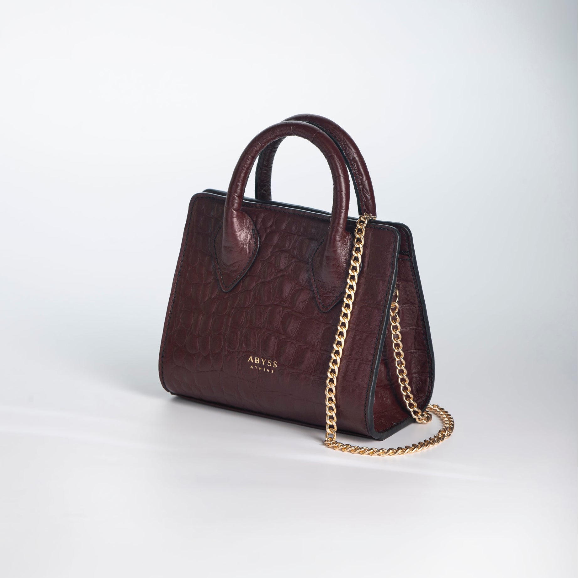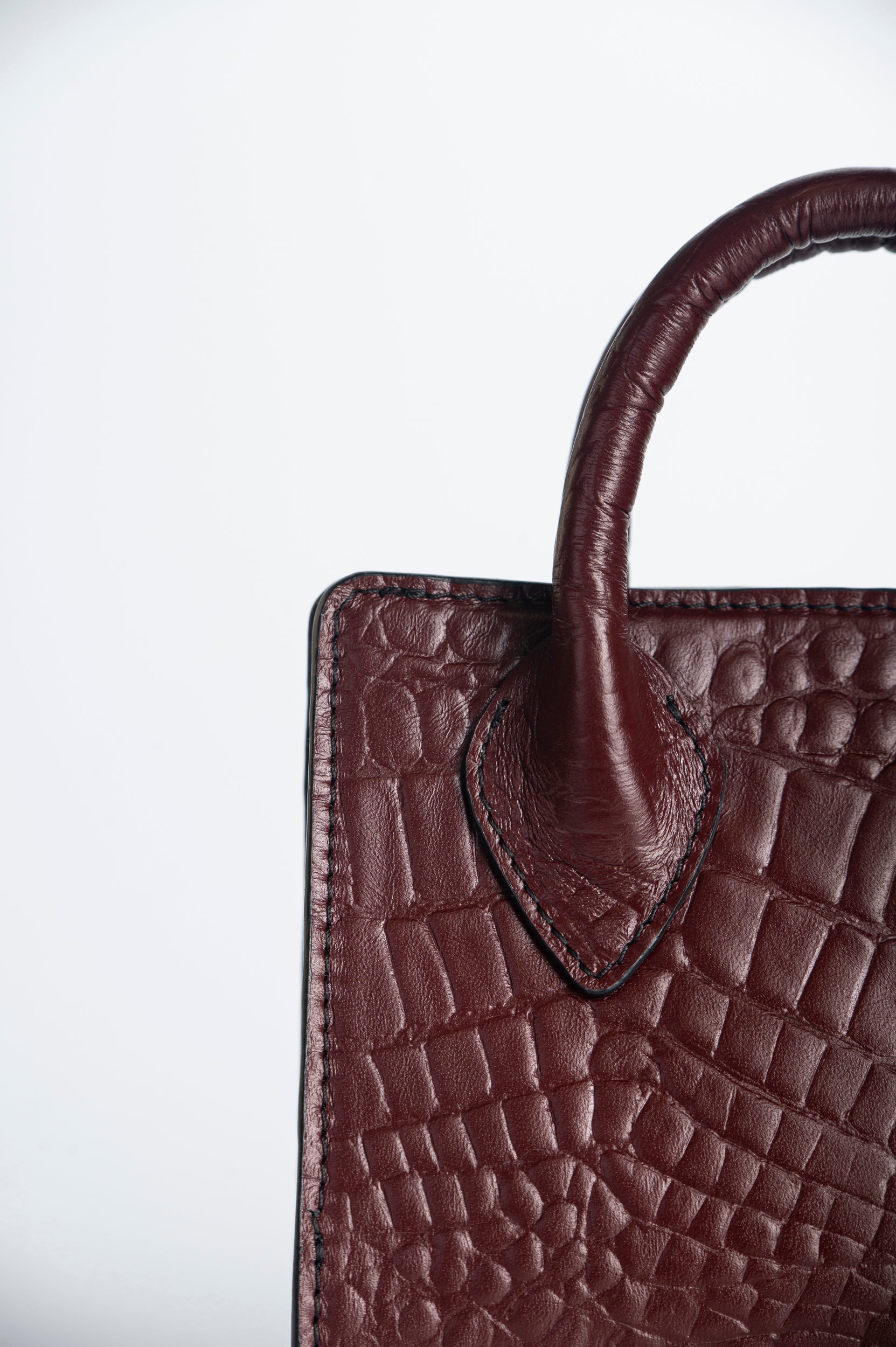 Το μπορντό κροκό δέρμα εισάγει μια πιο ζεστή και εκφραστική διάσταση, χωρίς να αλλοιώνει τη λιτή αισθητική της τσάντας.