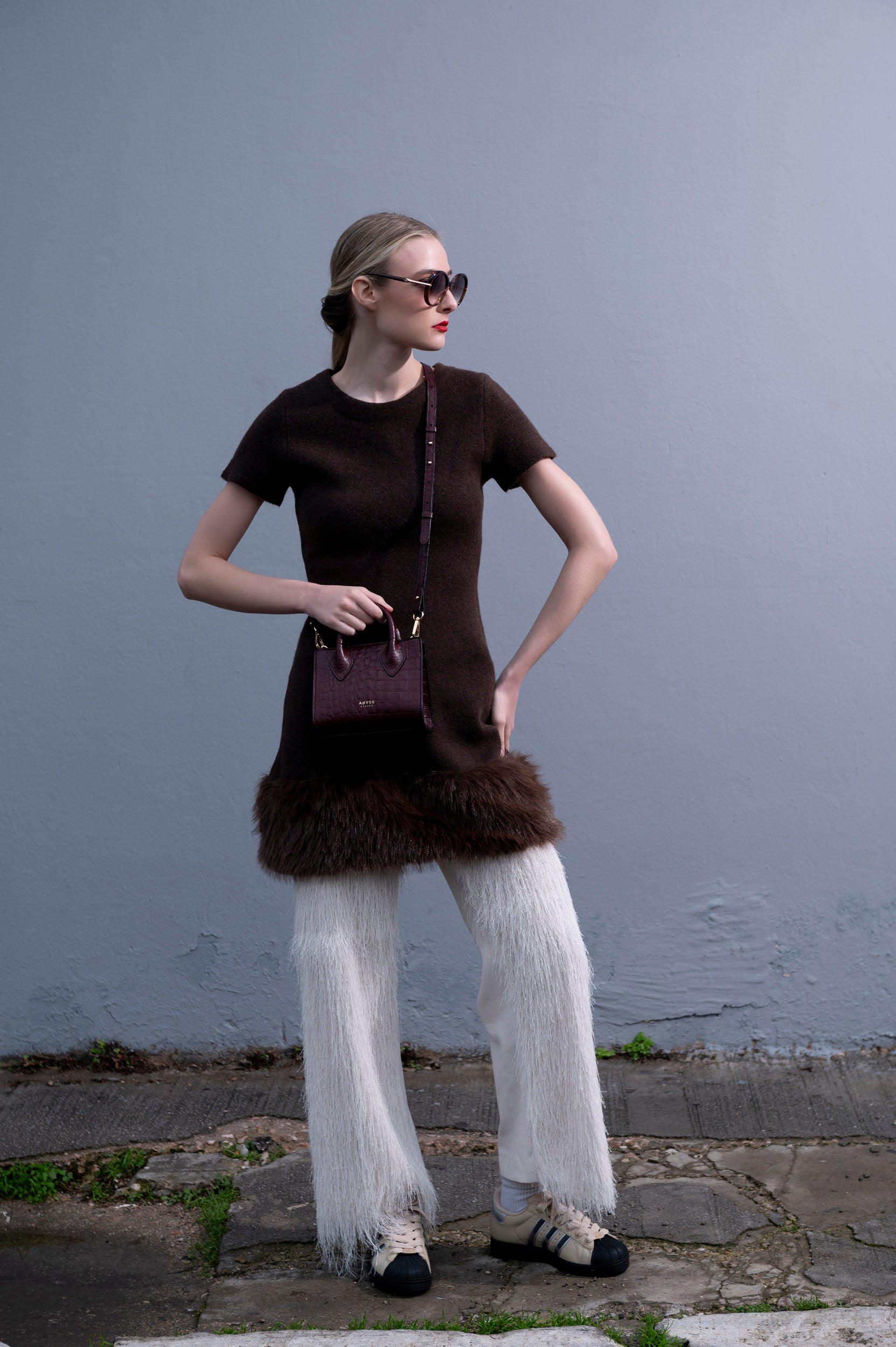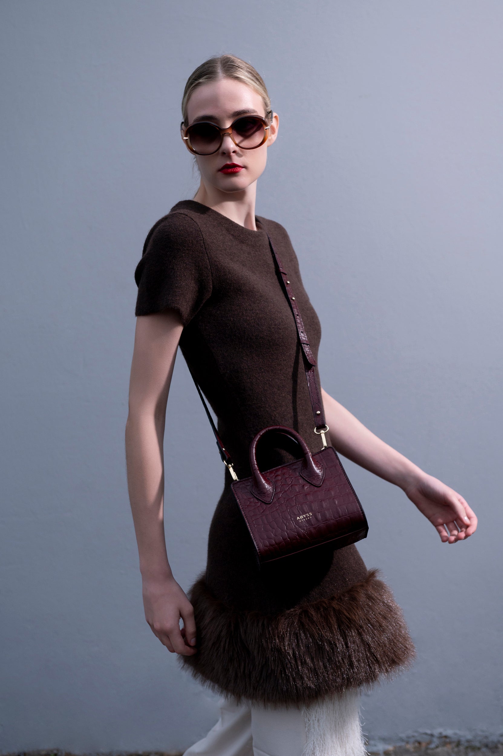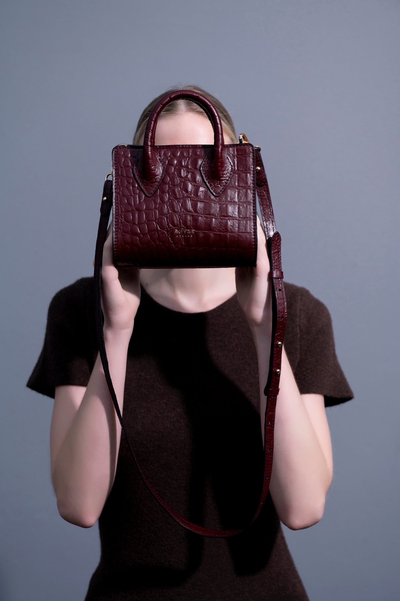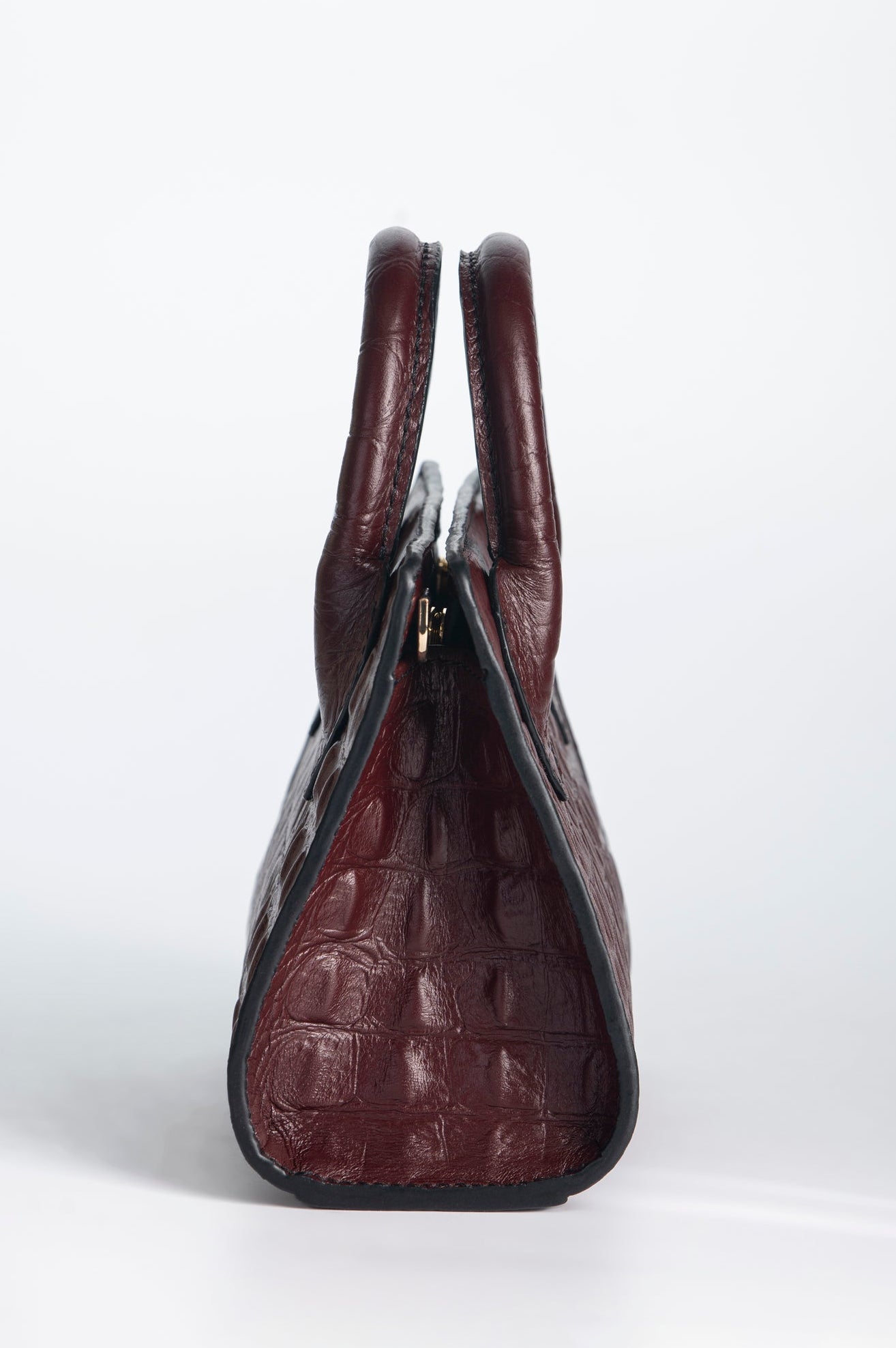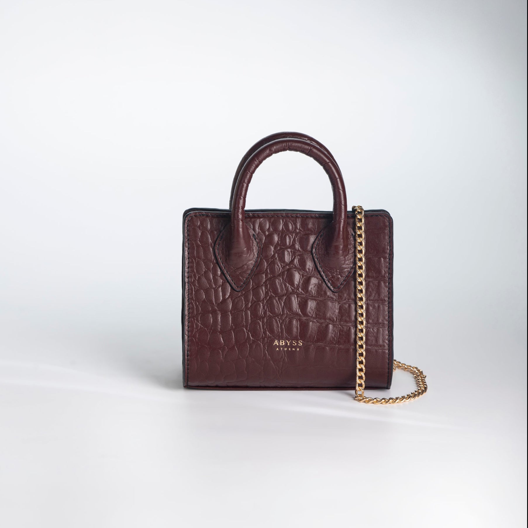 Το μπορντό κροκό δέρμα εισάγει μια πιο ζεστή και εκφραστική διάσταση, χωρίς να αλλοιώνει τη λιτή αισθητική της τσάντας.